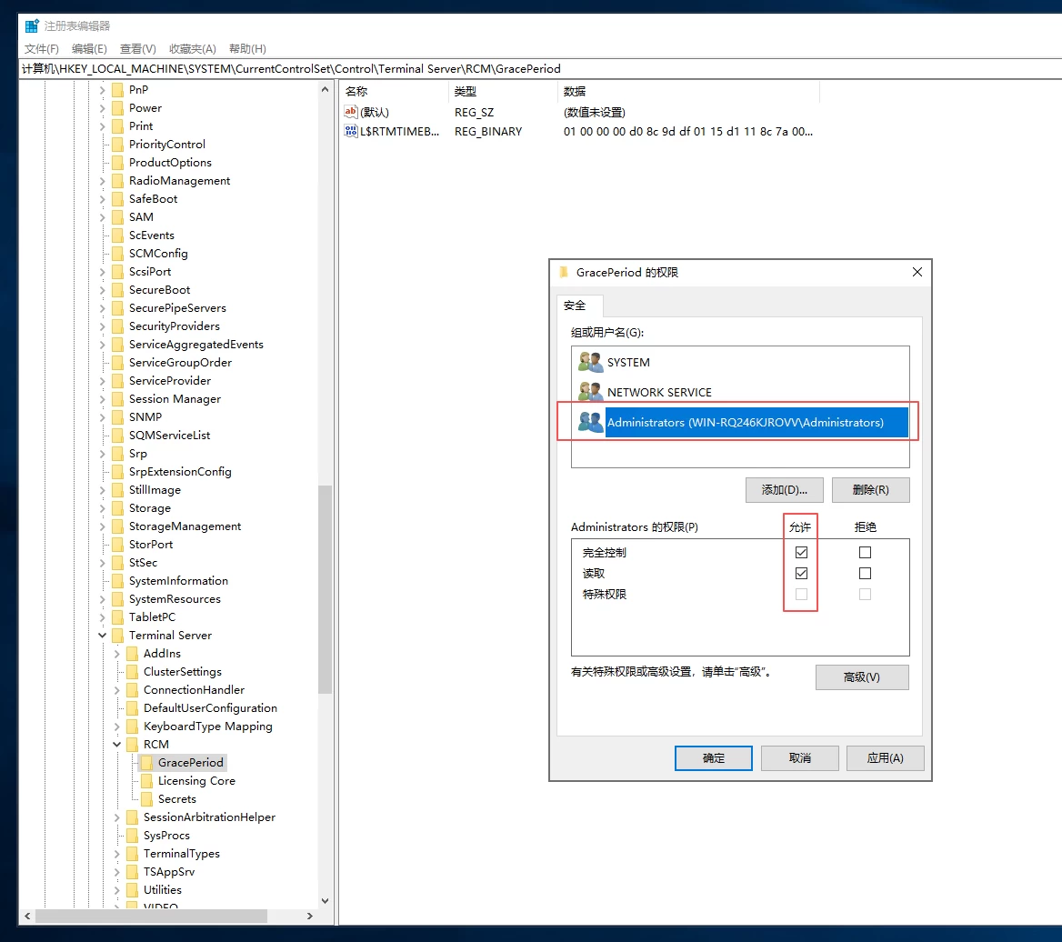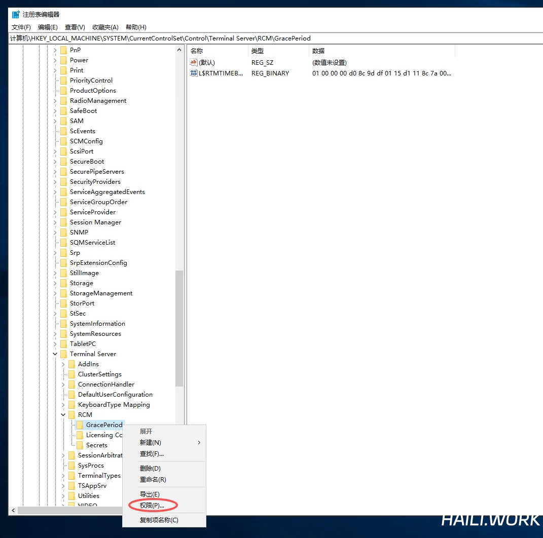 重新进入注册表路径(HKEY_LOCAL_MACHINE\SYSTEM\CurrentControlSet\Control\TerminalServer\RCM\GracePeriod)