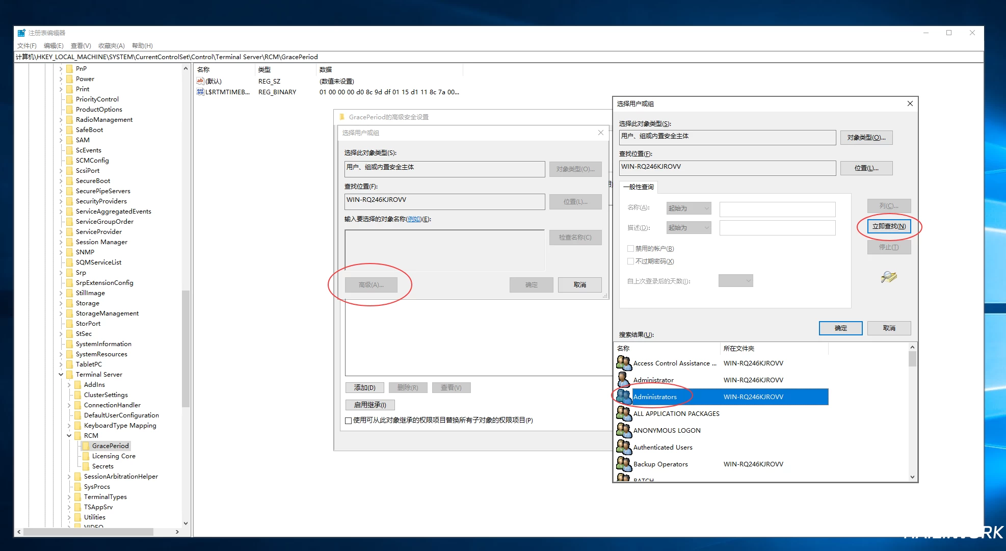 点击“立即查找”,选中“Administrators”,点击“确定”