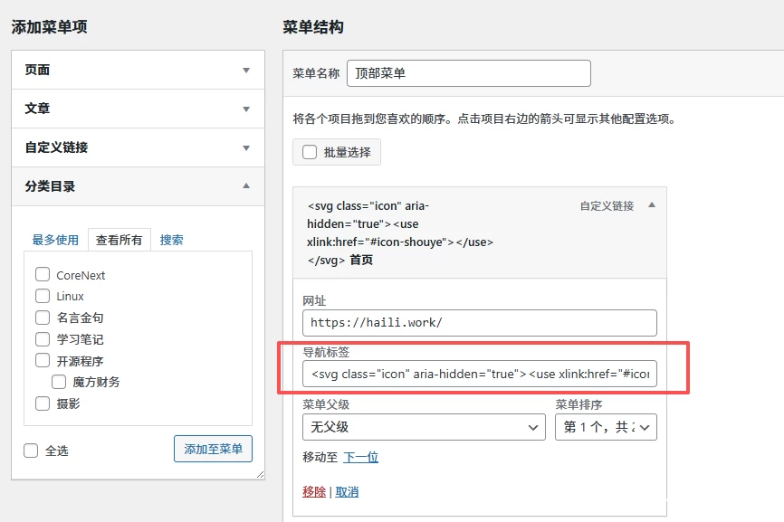WordPress后台 -> CoreNext 主题设置 - > 插入代码 -> Iconfont地址