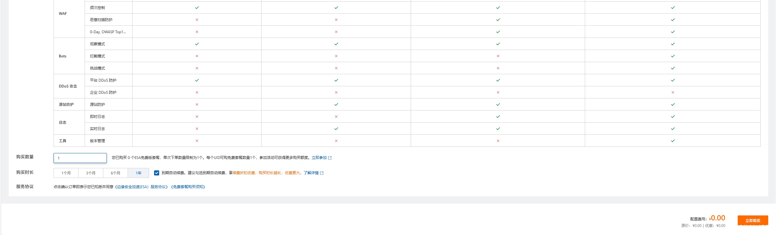 左下角可以选用免费版的时限,可以选择“1年”,勾选“到期自动续费”