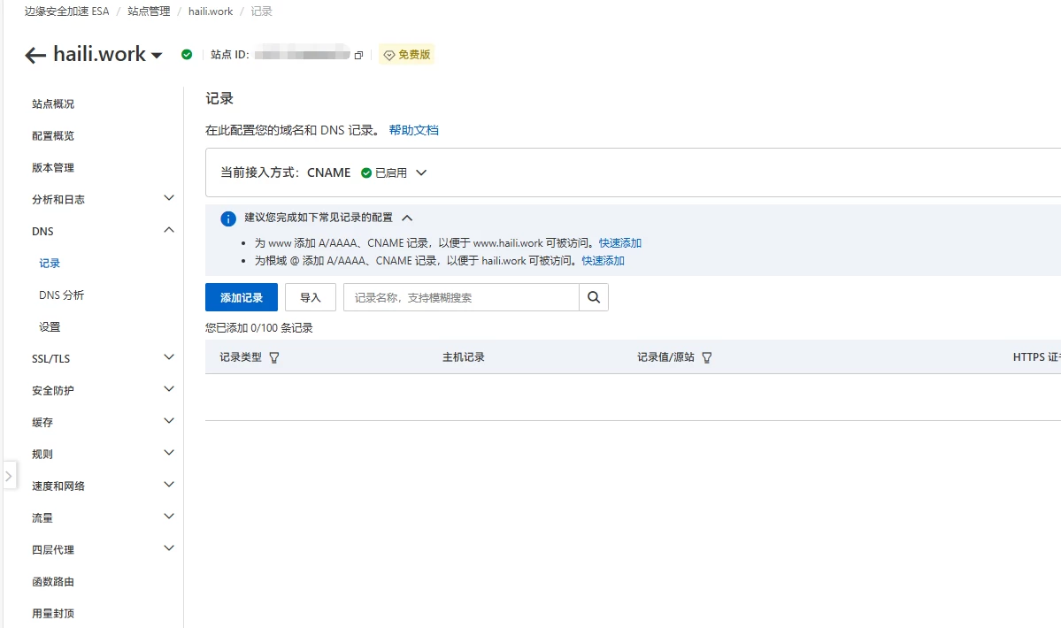 验证通过后会自动进入站点概况页面,这时候我们点击左侧导航的 DNS ,点击 记录 ,就可以添加我们的解析记录。