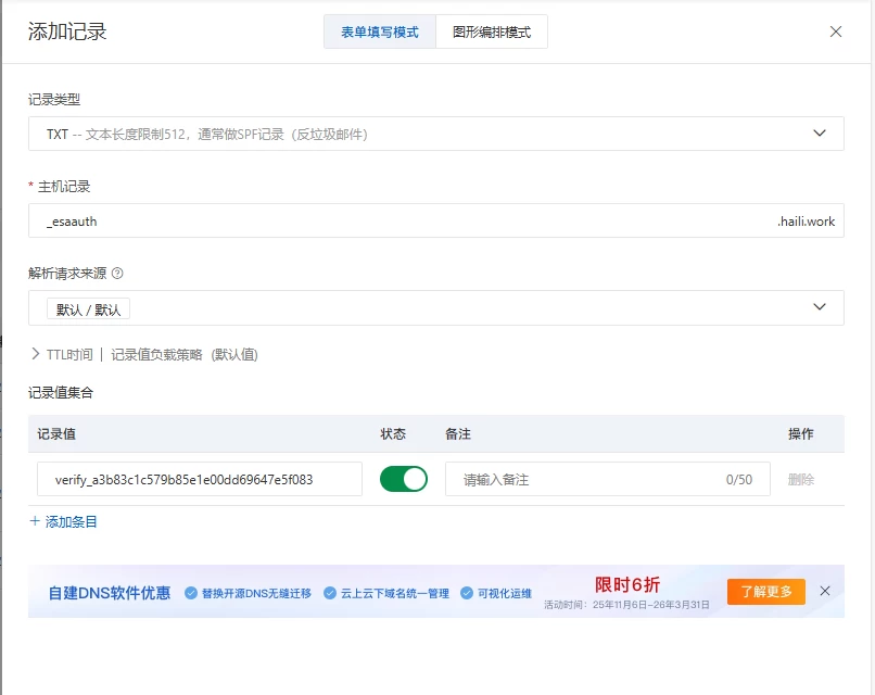 在自己的域名DNS解析页面根据页面提示添加一条 TXT 记录来证明域名的归属权。