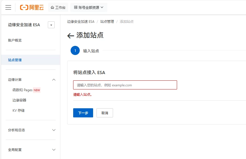 进入边缘安全加速 ESA 管理页面后,进入左侧导航栏中的“站点管理”,点击“新增站点”