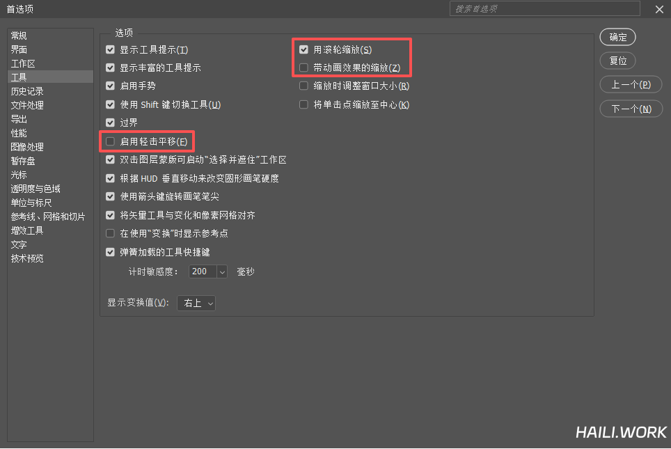 2.取消勾选带动画效果的缩放 和启用轻击平移 的功能选项