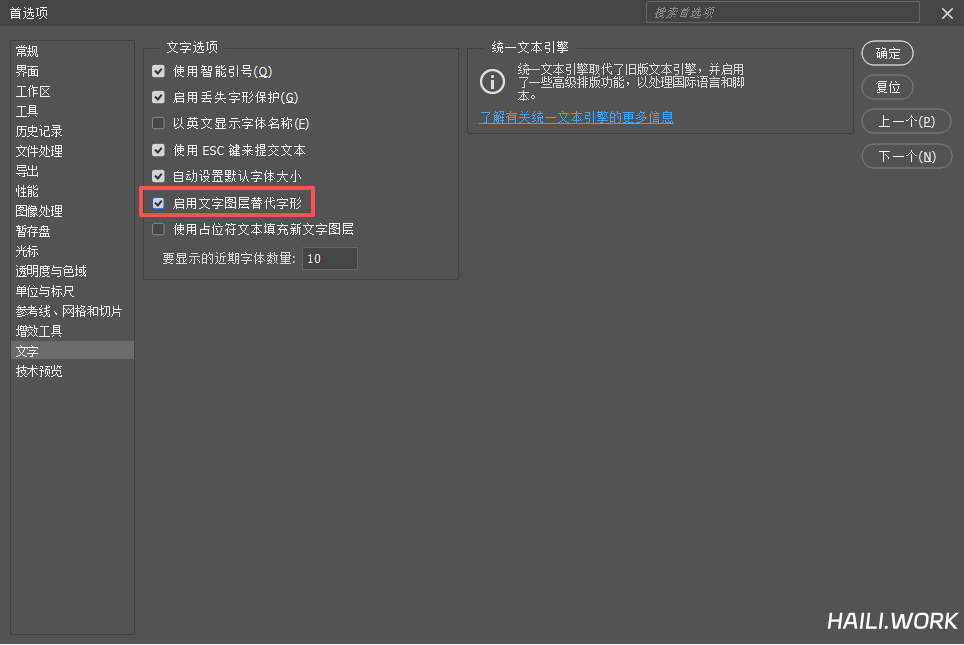 注释:这个不勾选的话,你在选择文字的时候底部会出现几个代替字形,拖慢你的运行速度。