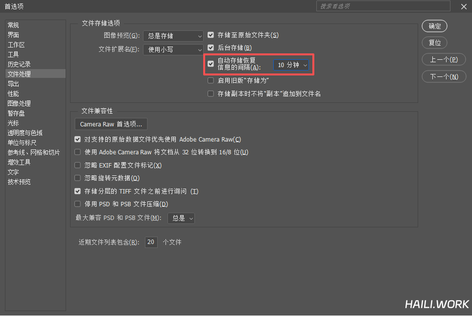 1.将自动存储恢复信息的间隔 修改为5分钟