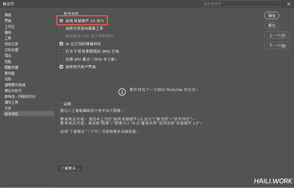 打开步骤:编辑 - 首选项 - Camera Raw 首选项